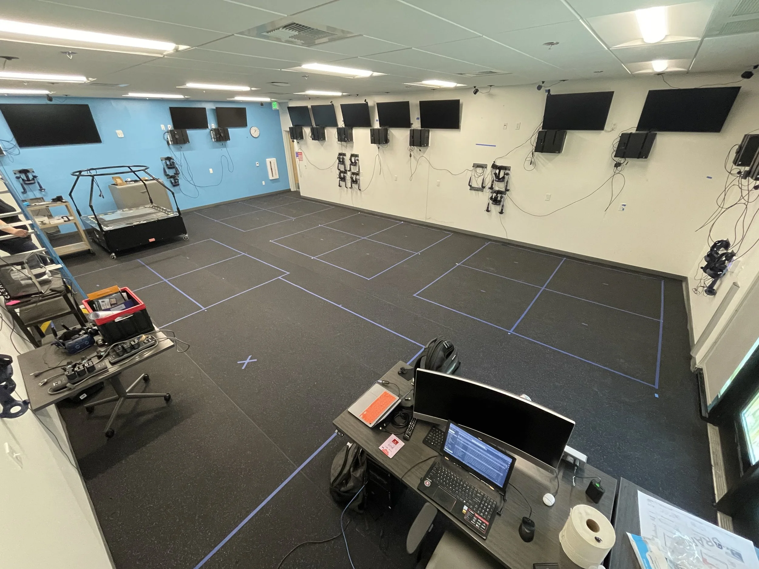 A fully operational immersive lab with 18 room-scale VR headsets and an Infinideck omnidirectional treadmill.